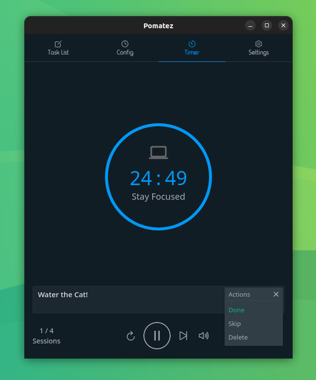 我按下 “开始” 按钮启动了定时器,并开始查看了任务的可执行操作。我可以标记任务为 “ 完成 Done ”,跳过任务,或者从应用中删除任务。