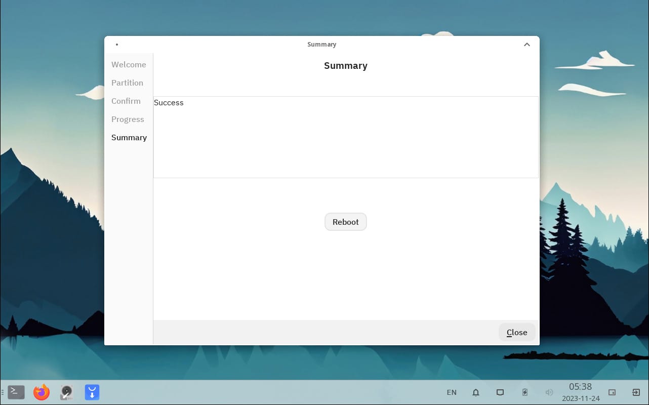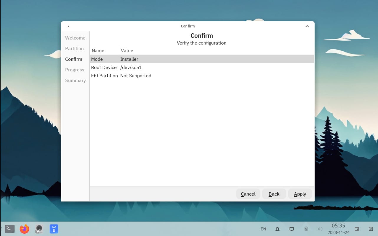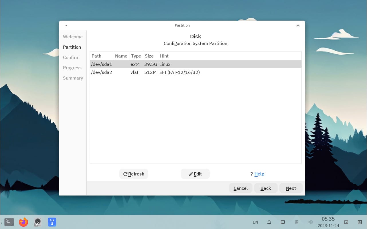 安装程序还给出了关于分区的有效提示,将较大的一个标记为 Linux,将较小的一个标记为 EFI