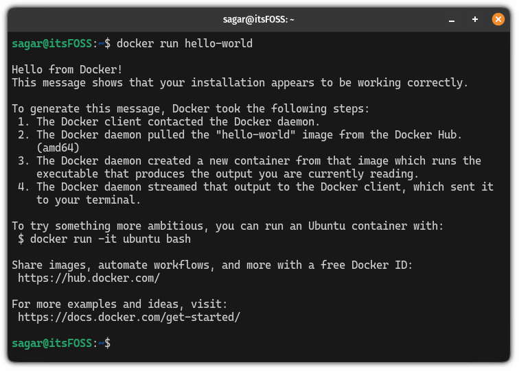 就是这样!从现在开始,你可以使用 docker 命令而不需要 sudo,就像我运行 Docker Hello World 镜像一样: