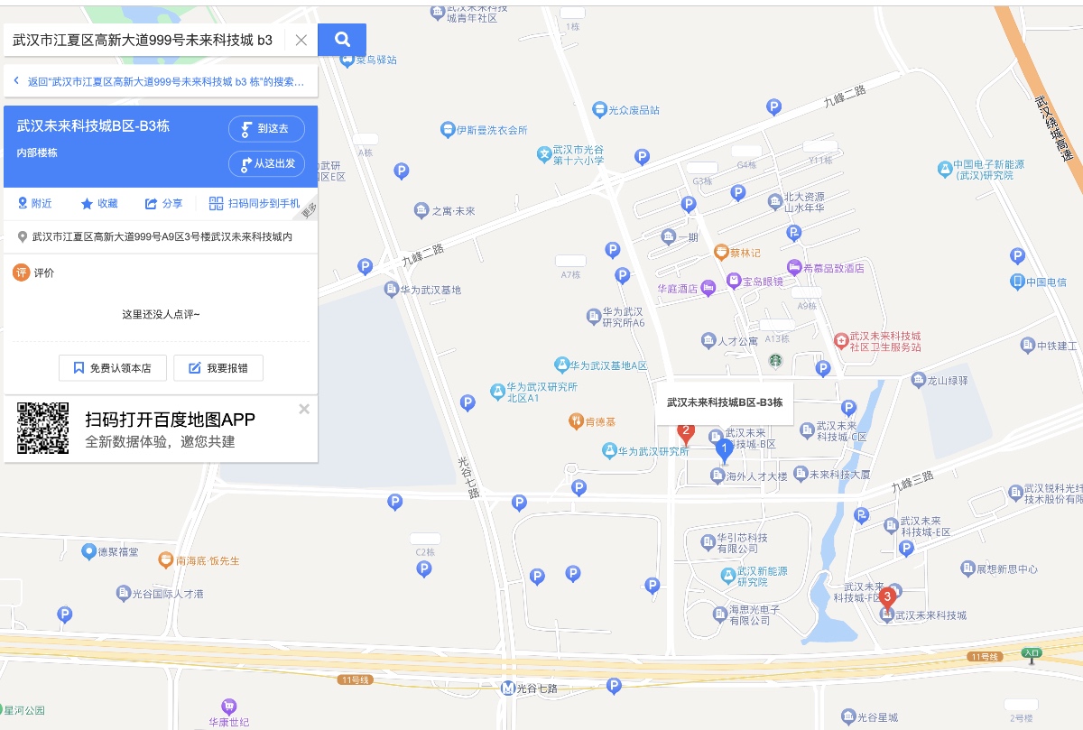 - 公共交通:地铁:乘坐轨道交通 11 号线,「光谷七路」D口出站,步行 600 米到。
